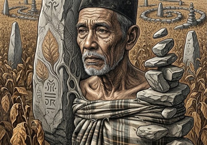 Batu bersurat ini masih berdiri di sini. Masih mati dalam peraduan nasib di bawah pohon kamboja yang batang pohonnya berongga,…